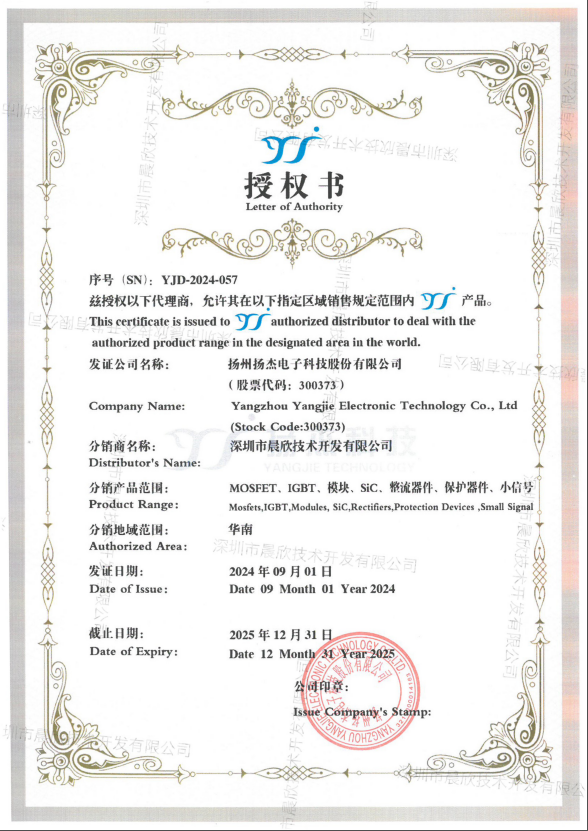 深圳市翌芯半导体有限公司(以下简称“翌芯半导体”)为华晨锦悦旗下全资子公司,翌芯半导体作为扬杰电子的代理商,其角色不仅限于销售和分销,通过深度合作,翌芯半导体能够凭借扬杰电子的技术力量和产品优势,更好地服务于国内外客户,同时也加强了双方在市场推广和品牌建设方面的合作。翌芯半导体的市场网络和客户服务能力,加上扬杰电子的技术和产品支持,形成了强大的协同效应,为客户提供更加优质和高效的服务。